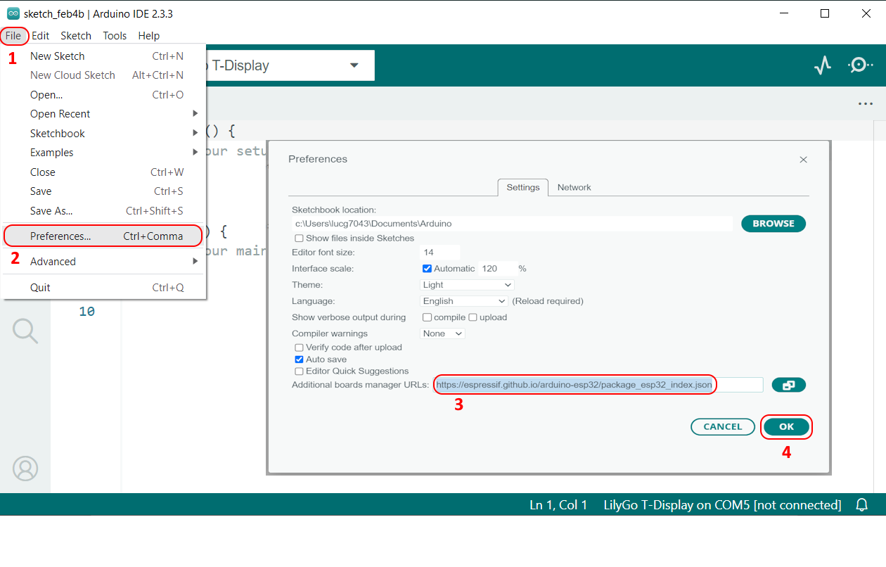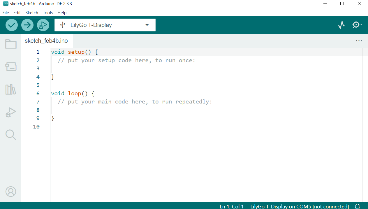 We zullen de Arduino IDE v2.x gebruiken om onze ESP32 microcontroller (T-Display) te programmeren. Deze IDE biedt als grootste voordeel de simpliciteit en stabiliteit.