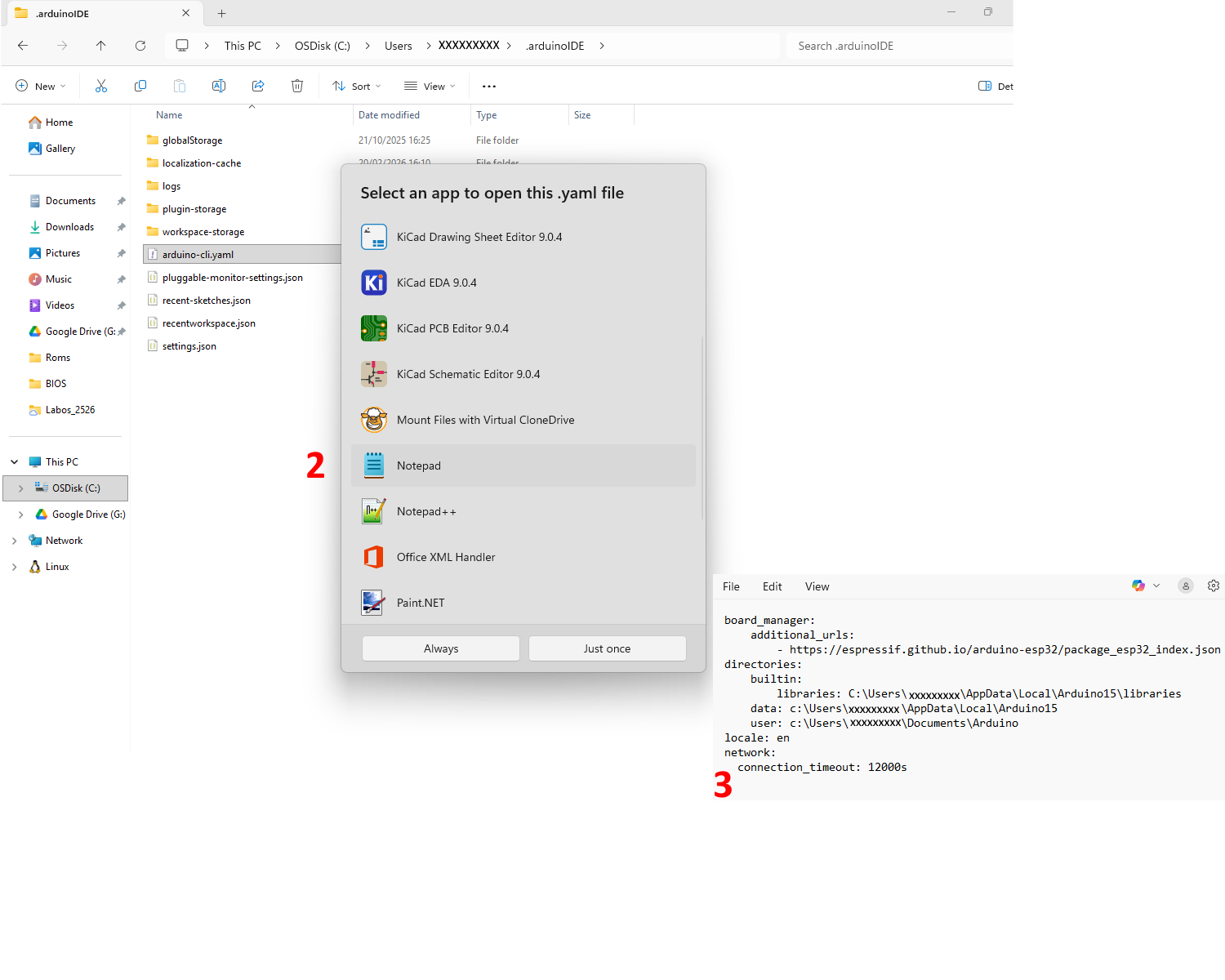 Open het bestand op het volgende pad in een teksteditor: C:\Users<username>.arduinoIDE\arduino-cli.yaml of C:\Gebruikers<gebruikersnaam>.arduinoIDE\arduino-cli.yaml (Hierbij