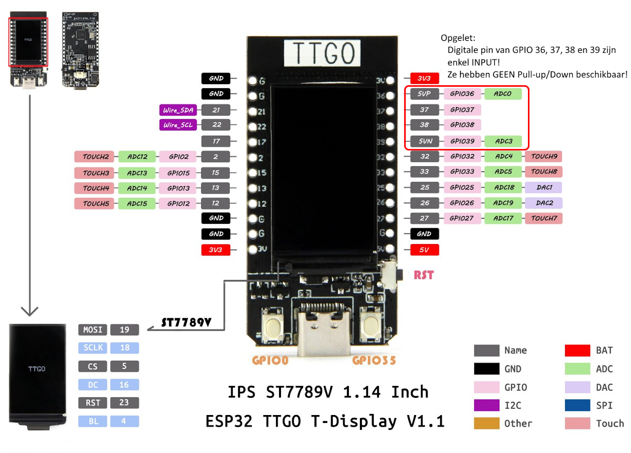 De TTGO beschikt over een groot aantal GPIO (General Purpose Inputs and Outputs), ze kan deze zien op de afbeelding hieronder.