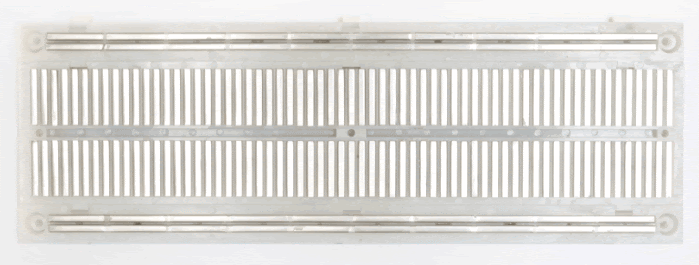 Je moderne breadboard is reeds voorzien van enkele doorverbindingen (zie hieronder).