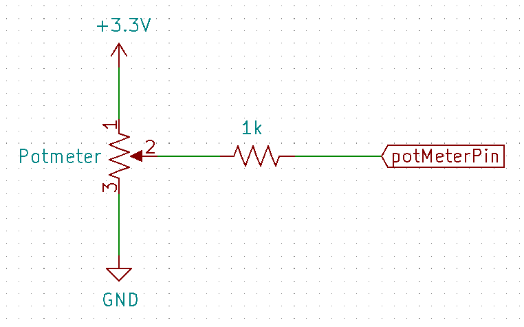- Sluit de buitenste pinnen van je potmeter aan op de + en - (respectievelijk 3.3V en GND). Zoek zelf uit of de polariteit een rol speelt