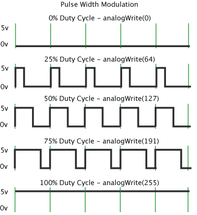 In geval van PWM hebben het over een digitale uitgang (we kunnen alleen 0 V of 3.3 V uitsturen), maar we gaan hierbij voortdurend schakelen tussen deze twee waardes. Indien we op die wijze bv. een LED zouden aansturen, dan zien we die LED knipperen indien de gehanteerde frequentie laag is (enkele Hz tot maximaal enkele tientallen Hz). Bij hogere frequenties (pakweg boven 70 Hz) reageren onze ogen echter te traag om het aan- en uitschakelen nog waar te nemen. Wat we wel merken, is dat de LED feller lijkt te branden bij een hoge duty cycle dan bij een lage. De duty cycle geeft aan hoeveel procent van de periodetijd de uitgang actief is. Uiteindelijk komt de lichtintensiteit (ongeveer) overeen met de gemiddelde waarde van het PWM-signaal.
