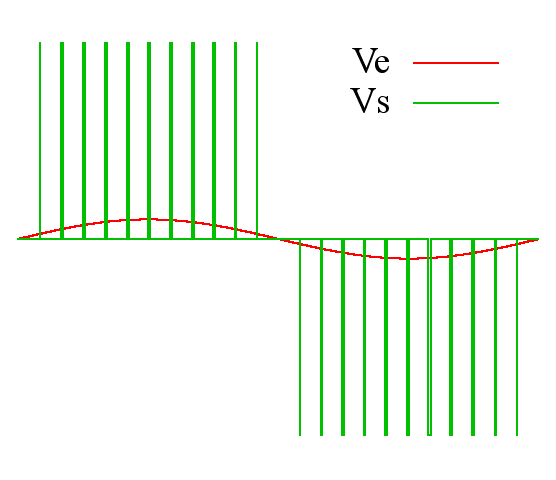 Door gebruik te maken van een eenvoudige filter kan je het PWM signaal omvormen naar een analoge spanning. Dit wordt voorgesteld in de rechtse figuur hierboven: de groene puls-trein is het PWM signaal, het rode sinusvormige signaal is na filtering. Let op, de meeste microcontrollers kunnen enkel een positieve spanning aanleggen, dus de bovenstaande GIF is niet representatief voor onze ESP32!