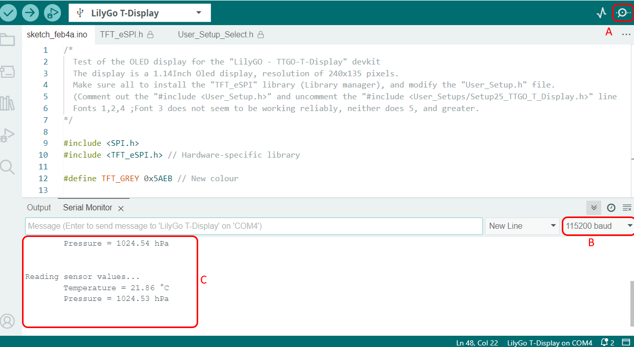 De display op de TTGO kan handig zijn tijdens het debuggen van code. Er is echter ook nog een andere manier om leesbare feedback te krijgen van je microcontroller, namelijk met behulp van de Serial Monitor.