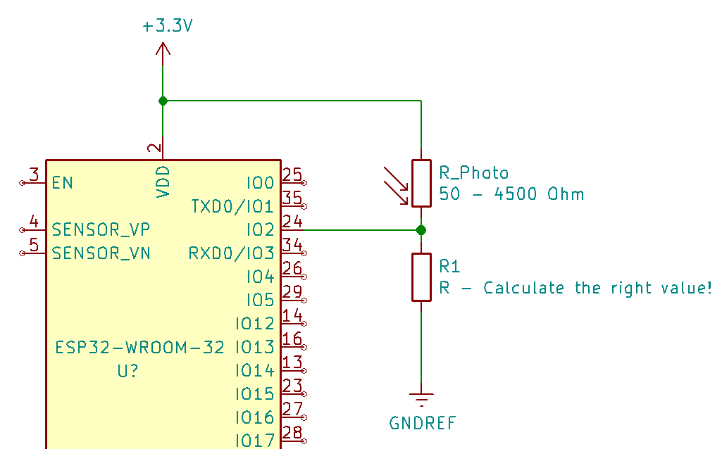 LDR staat voor “Light Dependant Resistor” of photoresistor, een licht gevoelige weerstand dus. Dit is een weerstand waarvan de weerstandswaarde zal veranderen met de hoeveelheid licht die invalt aan de bovenzijde van de component. In de meeste gevallen zal de weerstand in donkertoestand hoog zijn ~200 kOhm en laag in belichtte toestand ~10 kOhm. Het gevoelige materiaal in deze sensor is in veel gevallen “cadmium sulfide” voor goedkope photoresistors. Een LDR is een “2-terminal device”, dus een component met 2 pootjes. Deze heeft geen specifieke polariteit. Om de sensor uit te lezen zullen we gebruik moeten maken van een spanningsdeler. Bouw je schakeling op, zoals hieronder aangegeven.