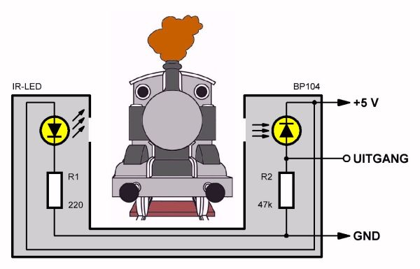 Vul de code hieronder aan, zodat je de status van je lichtsluis een interrupt triggert wanneer een object passeert.