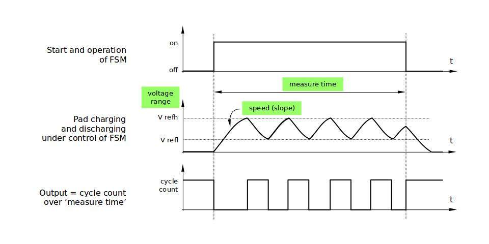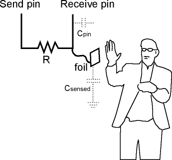 Er zijn dus 2 pinnen nodig op onze microcontroller, waarvan we er één van rol moeten kunnen wisselen ("Send pin": input/output), de “Receive pin” mag input-only zijn. Let op, dit zijn dus “digitale pinnen”, we moeten dus geen analoge pinnen opofferen om gebruik te maken van deze functionaliteit. In de afbeelding hierboven kan je ook een condensator ontwaren: Csensed. Deze wordt gevormd door: een stukje metaal(-folie) enerzijds en je lichaam anderzijds. Wanneer er geen lichaam in de buurt is, dan zal je de capaciteit meten naar de aarde, wanneer je in de buurt komt, dan zal de capaciteit sterk wijzigen. Klimatologische omstandigheden zoals variaties in de luchtvochtigheid en luchtdruk hebben bijgevolg een grote invloed op de gemeten waarde. Daarom is het nodig om regelmatig te her-kalibreren. Hoe wordt deze capaciteit nu gemeten: De Send pin wordt hoog gemaakt, dan wordt er een tellertje gestart. Het duurt enige tijd (enkele ms) totdat de Receive-pin ook hoog wordt, omdat de Csensed condensator opgeladen moet worden. De laadstroom wordt beperkt door de weerstand R. Wanneer beide pinnen dezelfde toestand aangeven, dan wordt de Send-pin laag-impedant gemaakt zodat Csensed hierover kan ontladen. Opnieuw wordt er gekeken hoe lang het duurt totdat de ze beide dezelfde toestand hebben aangenomen.