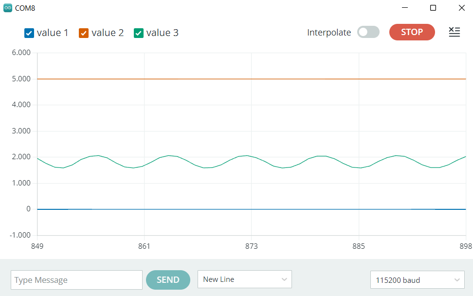 Er is een extra pin (2) gedefinieerd zodat je de functionaliteit van de sinus kort kunt testen in je seriƫle monitor/plotter. Verbind eenvoudigweg pin 25 of 26 met pin 2. Je kan altijd extra pinnen definiƫren om meerdere signalen tegelijkertijd te tonen.
