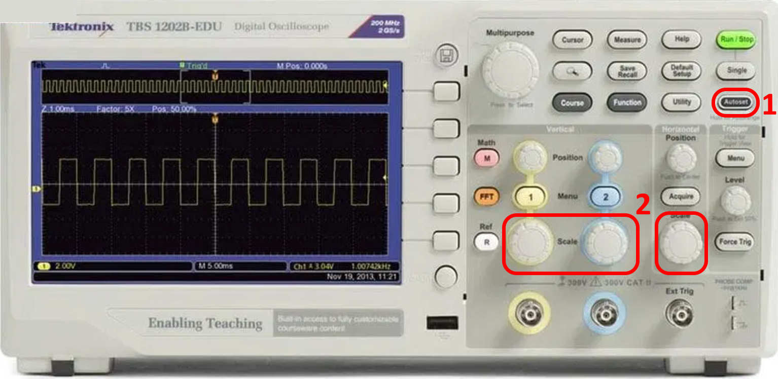 Tijdens dit laboratorium zullen we veel signalen moeten bestuderen om onze schakeling te debuggen. Dit kan via de serial plotter, maar we kunnen ook een oscilloscoop gebruiken. Hoewel een oscilloscoop veel functionaliteiten heeft, beperken we ons in dit laboratorium tot de draaiknoppen per kanaal (groen en geel in de onderstaande figuur) en de knop autoscale (of autoset). Deze knop stelt automatisch de juiste parameters in om het signaal duidelijk weer te geven.